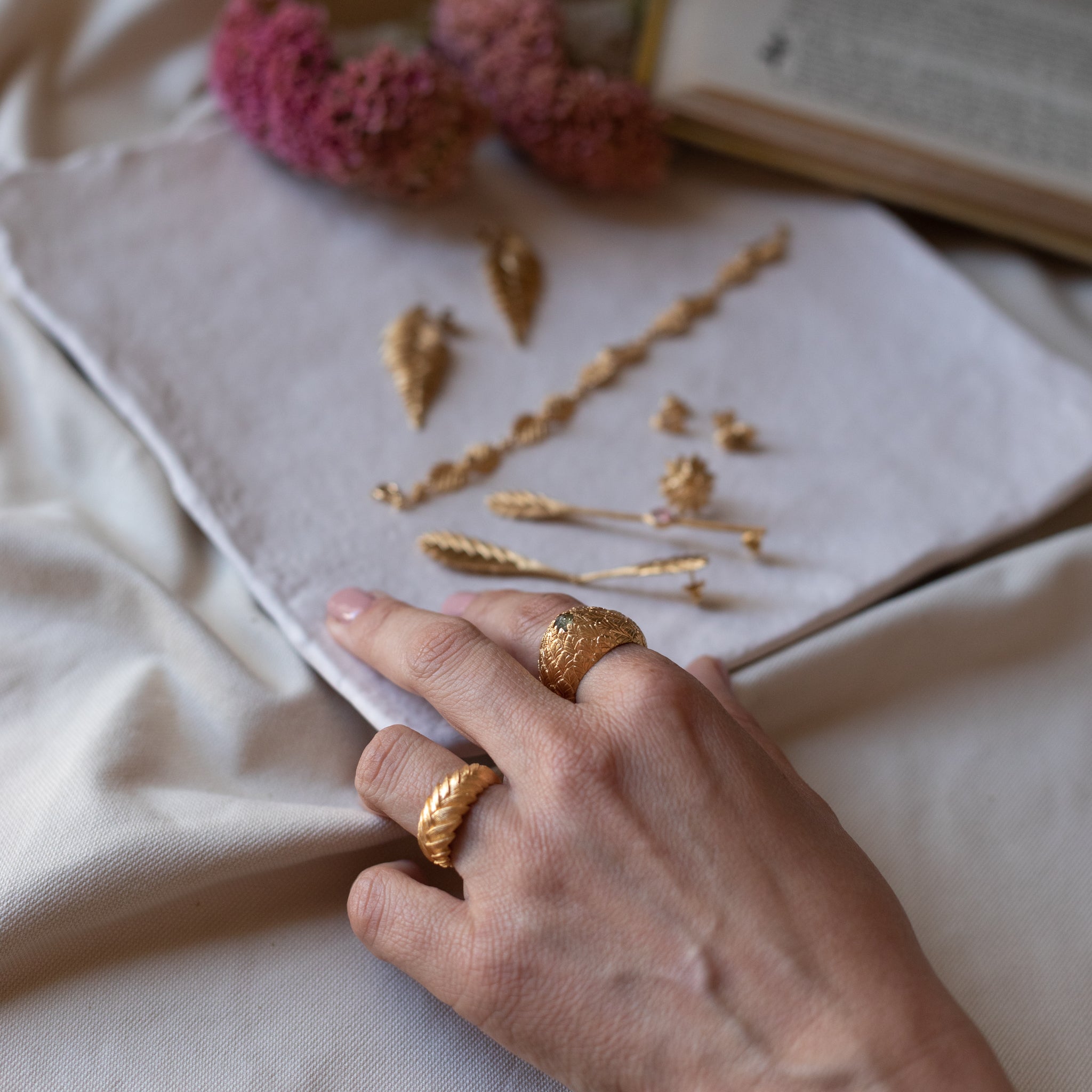 The statement ring of the season! Featuring layered Bromelia leaves, a dome silhouette and green Tourmaline in the center; this ring can be worn on your ring finger as a cocktail ring or your pointer finger with an artful flair.